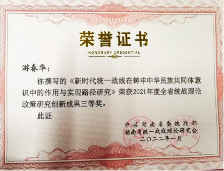 近日,由民革衡阳市委会兼职副主委、民革英国上市公司官网365支部党员游春华撰写的《新时代统一战线在铸牢中华民族共同体意识中的作用与实现路径研究》荣获2021年度全省统战理论政策研究创新成果三等奖,此奖由中共湖南省委统战部和湖南省统一战线理论研究会共同颁发。2021年,支部游春华、彭艳、周海红等人执笔的名为《关于衡阳市省域副中心城市建设之城市综合交通枢纽建设的调研报告》,获衡阳市2021年度建议案、优秀调研报告一等奖,调研报告节选刊登在《衡阳政协》总第56期4刊上。游春华等人主笔的集体提案《关于推进我市陆港型国家物流枢纽建设的提案》获得市委书记秦国文的批示,撰写的《推动建筑产业数字化转型升级服务省域副中心城市建设》提案在《衡阳日报》刊出。