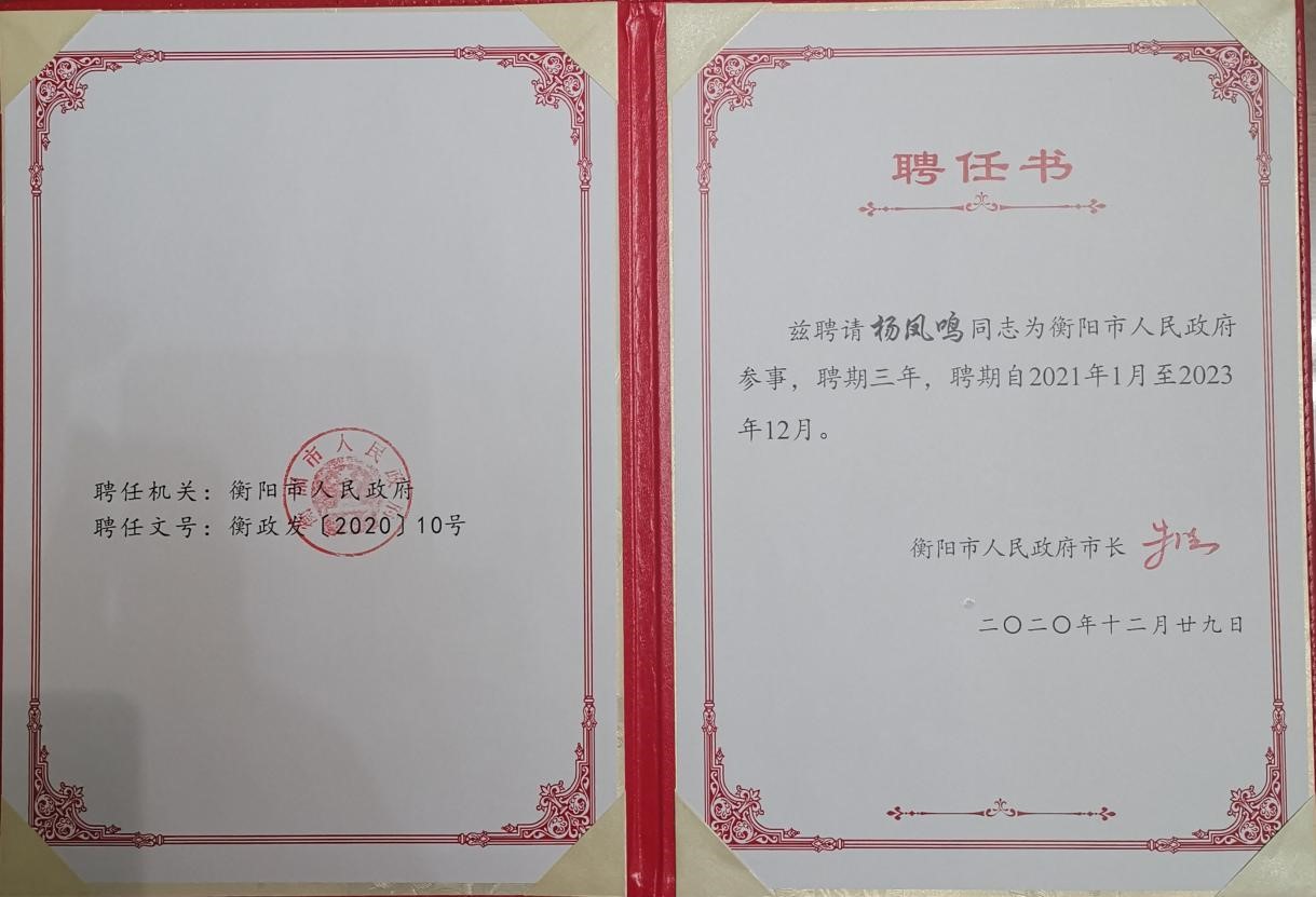 会上,衡阳市委副书记、市人民政府市长朱健为首批获聘的参事颁发聘书。英国上市公司官网365审计处处长、市政协委员、九三学社湖工支社副主委杨凤鸣教授获聘为首批参事。