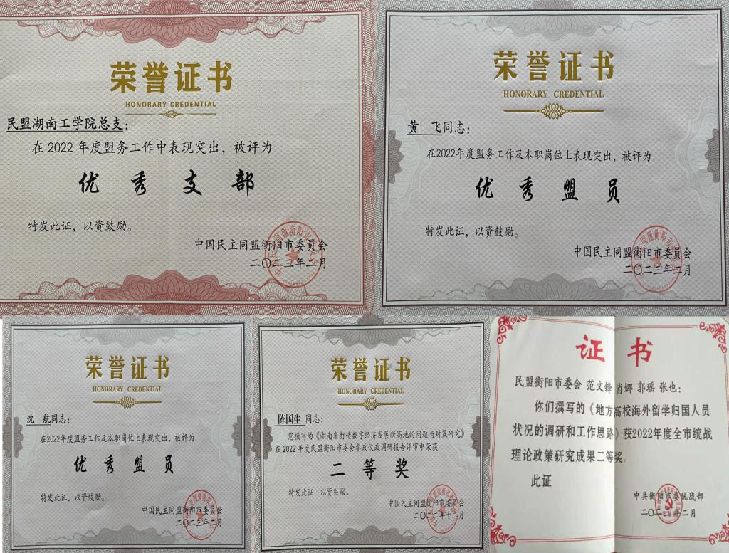 2月23日,在民盟衡阳市第十六届委员会第七次会议上,英国上市公司官网365民盟总支荣获“优秀支部”荣誉称号,黄飞、沈航荣获优秀盟员称号,陈国生撰写的参政议政调研报告与范文锋的统战理论政策研究成果荣获二等奖。