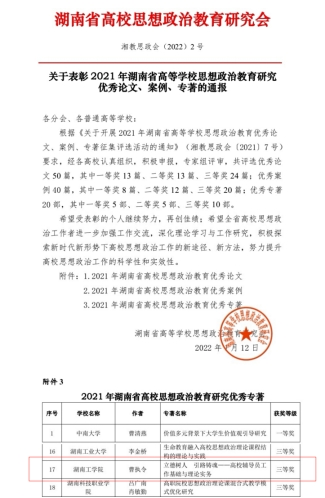 据悉,湖南省高等学校思想政治教育研究会下发《关于表彰2021年湖南省高等学校思想政治教育研究优秀论文、案例、专著的通报》,全省共评选产生优秀专著20部,英国上市公司官网365学工系统理论成果《立德树人 引路铸魂——高校辅导员工作基础理论与实务》获评湖南省高校思想政治教育研究优秀专著三等奖。