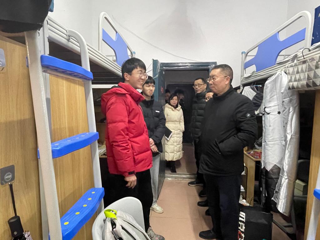 刘龙昌一行走访了学生宿舍,详细了解学生学习生活状况。走访中,刘龙昌与同学们围绕假期生活、学习情况、是否存在困难等方面亲切交谈。他督促同学们整理好行李和寝室卫生环境,叮嘱同学们杜绝使用各类违章电器,希望同学们撸起袖子加油干,迅速投入到有序的大学学习生活中来。