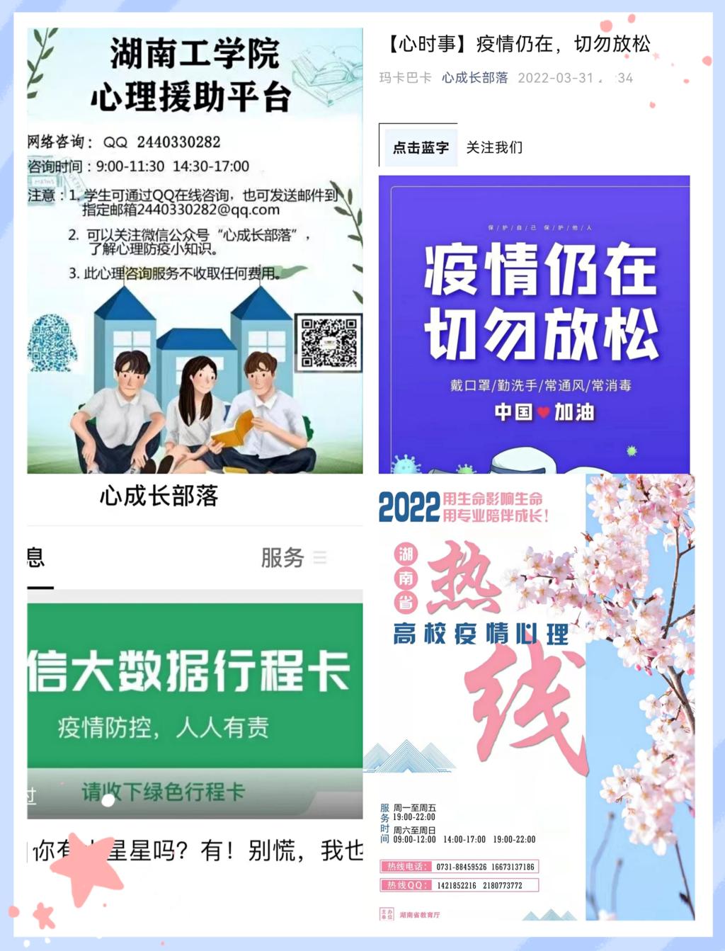 善为健康防疫的守护者。加大心理咨询服务力度,每天安排专人值班值守,节假日不休,每晚值班时间不少于2小时。针对因疫情隔离不方便到访的学生,适时推介省级心理援助工作平台,主动开展校级线上心理援助。加强校院二级联动,关注危机预警重点学生,定期排查,及时介入,做好安抚。利用“心成长部落”微信公众号,推送心理健康小知识,发布“你有小星星吗?有!别慌,我也有”等主题推文,及时缓解学生面对“全城带星”的恐慌情绪。