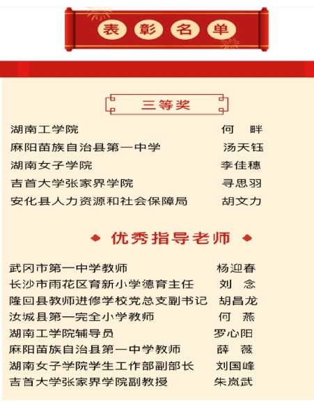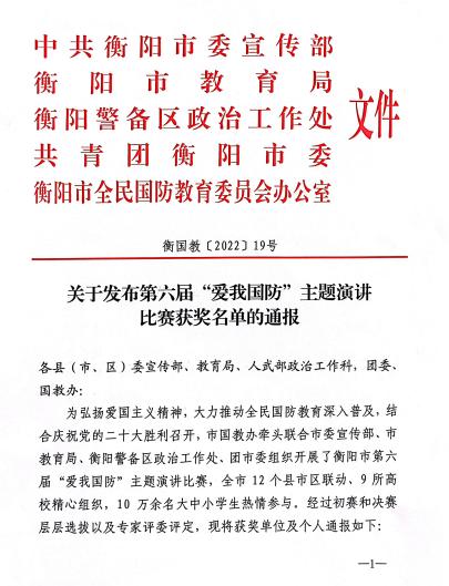 在衡阳市第六届“爱我国防”主题演讲比赛中,英国上市公司官网365土木与建筑工程学院何畔同学获青年组一等奖,安全与管理工程学院符佳好同学获二等奖,商学院洪一龙同学获优胜奖,罗心阳、傅娜两位老师荣获优秀指导老师,学校荣获优秀组织奖。