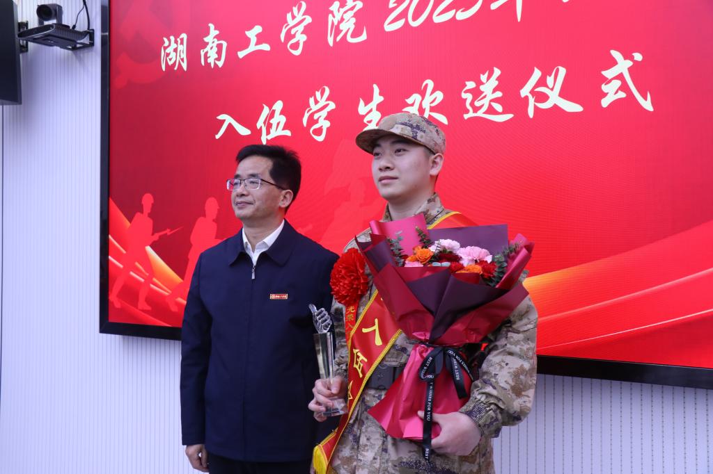 袁勤为应征入伍同学逐一披挂"光荣入伍"绶带,赠上刻有校徽的纪念品和鲜花高度肯定学校征兵工作成效,勉励应征入伍同学将专业知识融入强军实践,在军营大熔炉中继续加强学习,淬炼过硬军事本领早日成为一名“听党指挥、能打胜仗、作风优良”的新时代好战士,以优异成绩为国家为母校增光添彩。