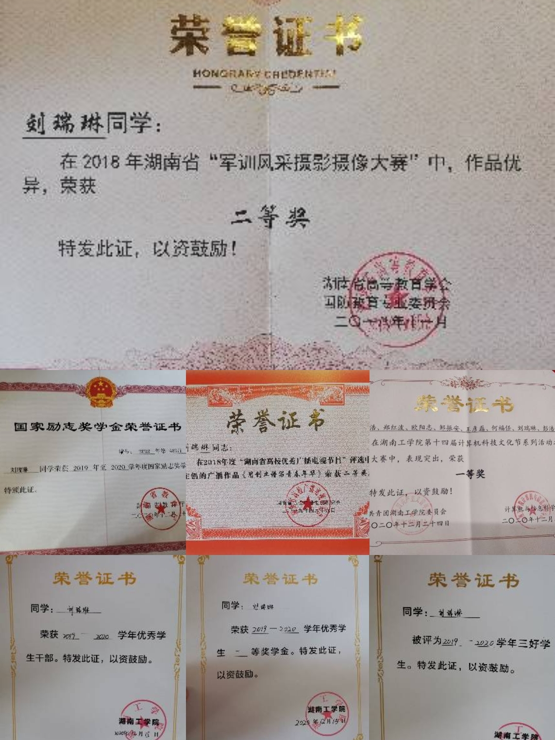 在校期间学习成绩与综合测评成绩连续三年在专业名列前茅;获国家励志奖学金、三好学生、优秀学生干部等各种荣誉奖励;荣获湖南省“军训风采摄影摄像大赛”二等奖、“湖南省高校优秀广播电视节目”二等奖、大学生志愿者暑期“三下乡”校级优秀个人、科技文化艺术节软件设计大赛一等奖。