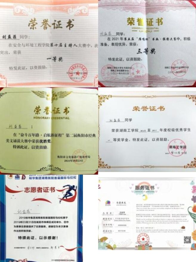 在校期间成绩优异,全面发展,获得国家励志奖学金3次、校级一等奖学金1次、校级二等奖学金2次、校级优秀学生干部标兵1次、校级优秀学生干部2次、校级三好学生1次、海鸥学习标兵1次、顺隆学习标兵2次、优秀五四共青团员1次、优秀五四共青团干1次。荣获湖南省第十四届挑战杯大学生课外学术科技作品竞赛三等奖1项,“创青春”大学生创业大赛“银奖”1项,“互联网+”大学生创新创业大赛“一等奖”2项、“三等奖”1项、“优胜奖”1项,“挑战杯”大学生课外学术科技作品竞赛“一等奖”1项、“二等奖”1项,大学生创新创业项目校级立项。此外,个人累积在校网以第一作者发表文章5篇,累积在外网以第一作者发表文章4篇。个人也多次参与志愿活动,荣获“优秀志愿工作者”。