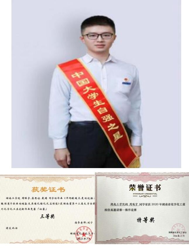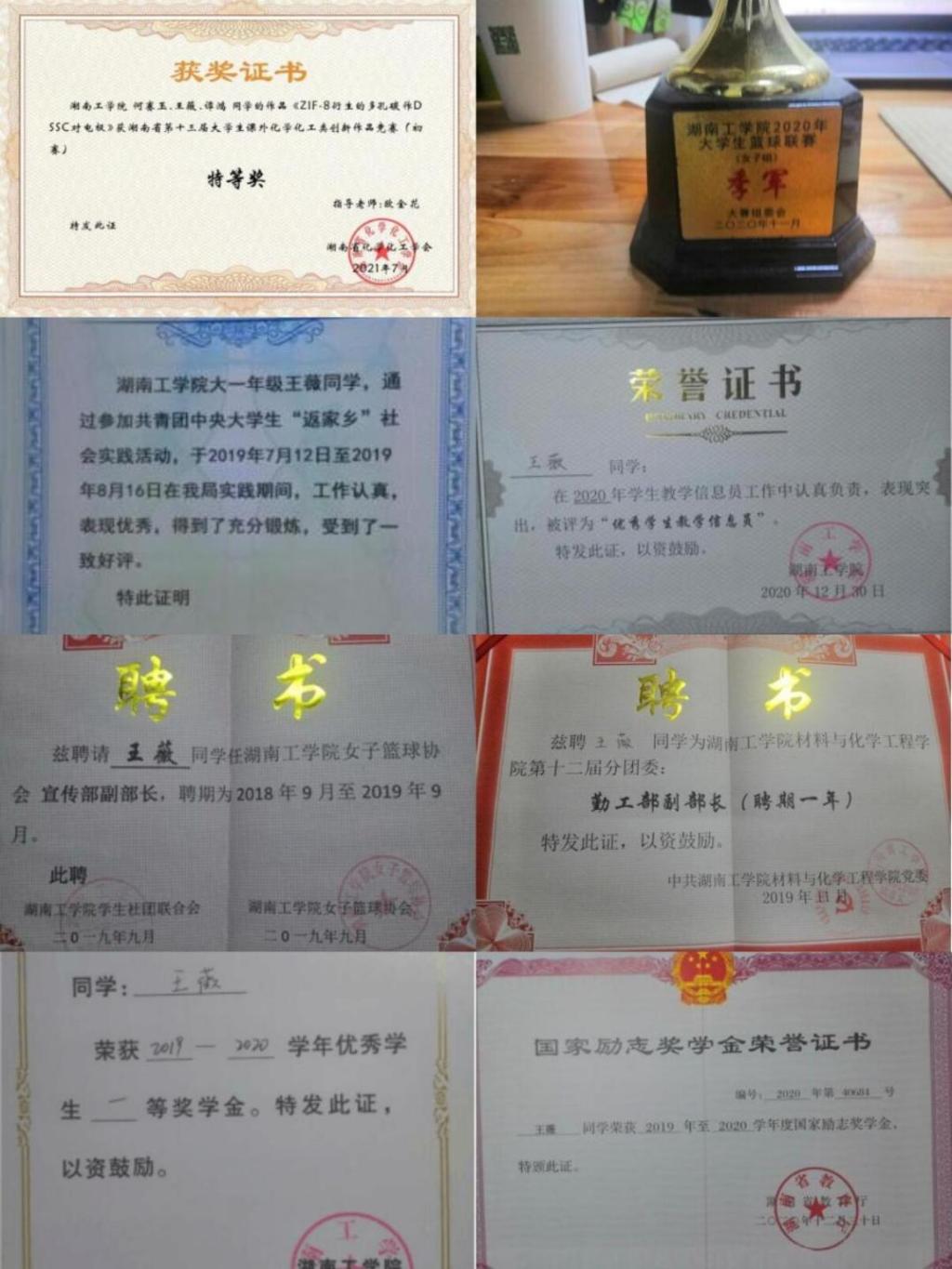大学期间平均学分绩点4.25分,专业第一。以优异的成绩通过英语四六级、乒乓球国家二级裁判员资格证书等考试。荣获国家奖学金1项,湖南省化学化工虚拟仿真比赛特等奖3项,湖南省大学生课外化学化工类创新作品竞赛二等奖2项、三等奖3项,湖南省大学生化学化工学科竞赛三等奖2项等20余项省级及其以上荣誉;荣获“互联网+”大赛一等奖2项,“挑战杯”竞赛特等奖1项、校一等奖学金3项等20余项校级荣誉;创新创业项目获得省级立项;在《能源化工》等期刊发表论文3篇、在《英国上市公司官网365校报》发表论文2篇。