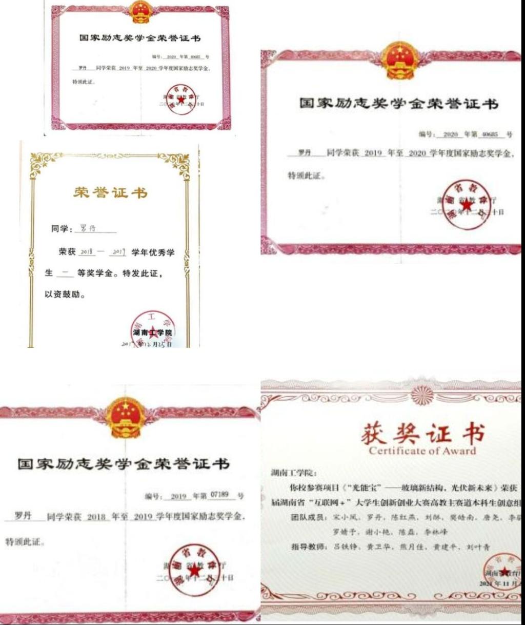 在校期间获得国家奖学金1次、国奖励志奖学金2次、校级一等奖学金3次、校级优秀学生干部2次、校级三好学生1次、校级优秀共青团干部2次,校级优秀共青团员1次和多项院级荣誉。以主要成员的身份参与了“建行杯”第七届湖南省“互联网+”大学生创新创业大赛,获得高教主赛道三等奖;英国上市公司官网365第七届“互联网+”大学生创新创业大赛主赛道一等奖2项。此外,以衡阳光伏有限公司团队成员的身份入驻校创新创业孵化基地。连续三年参加大学生暑假三下乡社会实践活动,以队长的身份带领队员开展好实践活动。