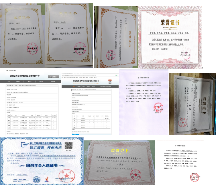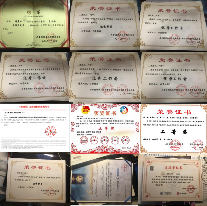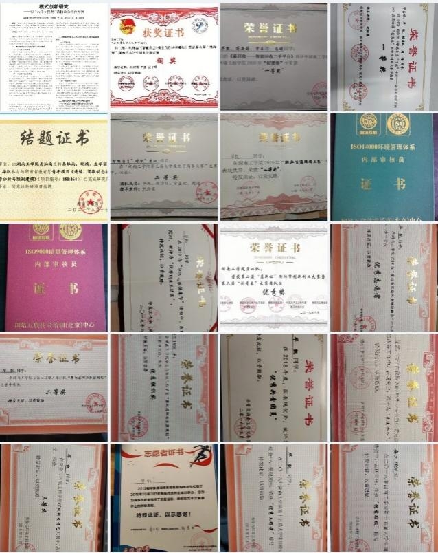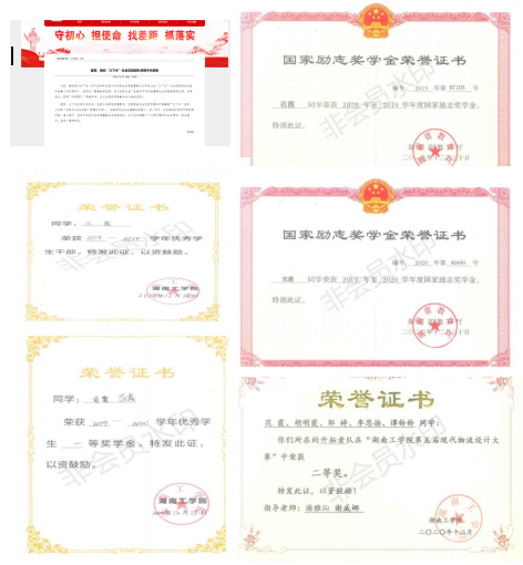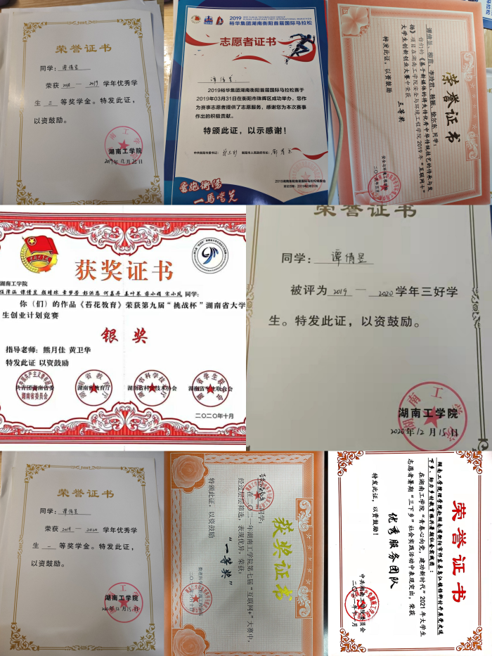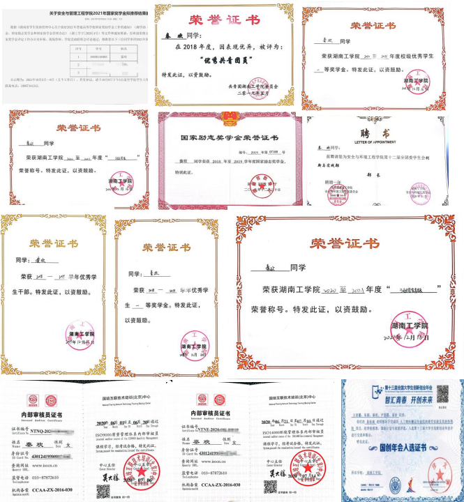 在校期间曾获得国家励志奖学金、校级二等奖学金、校级三等奖学金、优秀共青团员、先进个人、正大杯营销大赛三等奖、互联网+一等奖、湖南省省级科研项目、湖南省挑战杯铜奖、发表论文于英国上市公司官网365校报一篇、国家级大创项目负责人并完成结项、协助老师发表论文于一般公开刊物。并通过英语四六级、计算机二级、ISO9001质量管理体系内部审核员、ISO15000环境管理体系内部审核员。