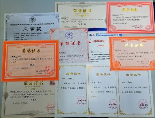 在校期间荣获全国第5届安全科学与工程大学生实践与创新作品大赛二等奖,校级一等奖学金1次,五四优秀团干1次,优秀学生干部2次,三好学生1次;2022年以项目负责人的身份参加湖南省大学生创业创新省级项目的立项工作;第七届“互联网+”大赛校级三等奖,第四届英国上市公司官网365大学生电子商务大赛三等奖;在《煤矿安全》、《陕西煤炭》期刊分别发表论文2篇;暑期参与社会实践活动,荣获优秀个人,多次参加公益活动,被评为首届衡阳市国际马拉松优秀志愿者。
