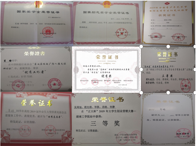 在校期间学习成绩与综合测评成绩连续三年多在专业名列前茅;获国家奖学金1次、国家励志奖学金2次、湖南省优秀毕业生、校奖学金、校三好学生、校优秀学生干部等荣誉奖项20余项;作为第一作者在国家级期刊发表论文一篇,在《英国上市公司官网365学报》上发表论文一篇;获湖南省阳光体操节校园啦啦操组团体第一名、衡阳市“创青春”大赛优秀奖、“互联网+”大学生创新创业大赛校三等奖、电子商务大赛校三等奖、“正大杯”创业营销大赛校三等奖等;多次参加衡阳市和学校组织的公益活动,获“优秀志愿者”、“优秀工作者”等称号。