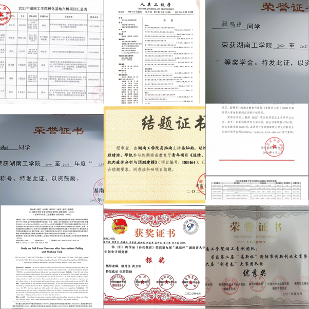 在校期间学习成绩与综合测评成绩连续三年在专业名列前矛;获国家励志奖学金2次、校级一等奖学金2次、校级三好学生2次、优秀学生干部2次、优秀共青团干部1次,优秀共青团员1次。积极参与创新创业大赛,为2020年大学生创新创业计划大赛国家级立项成员;获第九届“挑战杯”湖南省大学生创业计划竞赛银奖;第二届“高新杯”衡阳市创新创业大赛暨第六届“创青春”大赛团队组优秀奖;成功入住校级创业孵化基地。刻苦专研,参与湖南省教育厅优秀青年科研项目“连续、间歇动态拉力作业肌肉疲劳分析与预测建模”并成功结题;在《人类工效学》协助发表《模拟凿破作业肌肉疲劳发展实验研究》和《间歇拉物行走作业条件下拉力降幅特征分析》两篇论文。