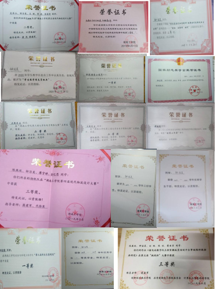 在校期间荣获国家励志奖学金2次,校级一等奖学金2次,校级三等奖学金1次,优秀共青团员1次,优秀共青团干1次,三好学生2次。分别以主要成员身份参与多项国家级和省级项目,在实践中检验真理;参与2020年大学生创新创业训练计划获国家级立项;积极参加第九届“挑战杯”湖南省大学生创业计划竞赛获省级银奖;积极参加第七届“互联网+”大学生创新创业大赛青红赛道荣获校级一等奖;暑假参与三下乡社会实践活动,荣获校级优秀服务团队等荣誉。
