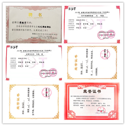 在校期间积极参与学科竞赛与科研活动,作为竞赛团队队长获得华为杯·全国大学生物联网设计大赛(华中及西南赛区总决赛)二等奖,华为杯·全国大学生物联网设计大赛(全国总决赛)优胜奖,获得实用新型专利1项。专业学习成绩名列前茅,荣获校一等奖学金1次、校级二等奖学金1次、校优秀学生干部1次、院优秀工作者1次。