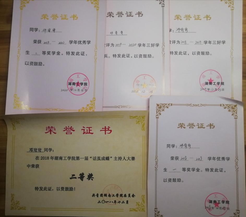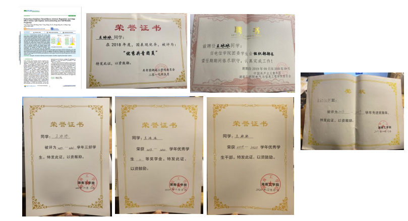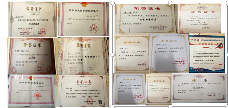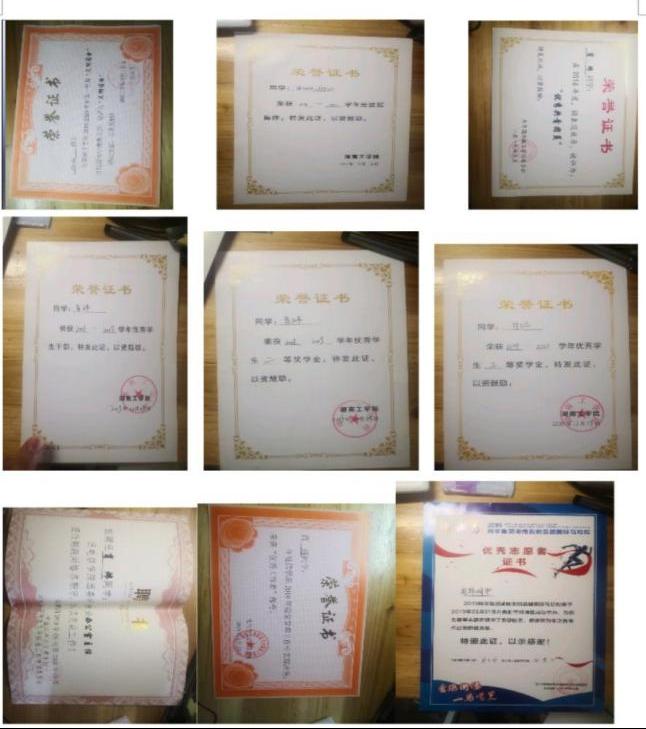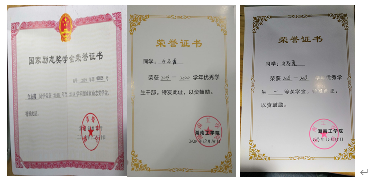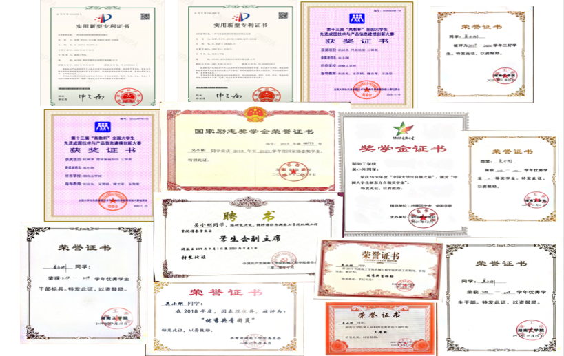 在校期间,连续两年专业成绩第一,整个大学生涯绩点专业第一,顺利通过英语四六级,获国家奖学金一次,国家励志奖学金两次,校一等奖学金两次,校友学习标兵奖学金,校级三好学生两次,校级优秀学生干部一次,湖南省优秀共青团干部,以及优秀工作者若干。