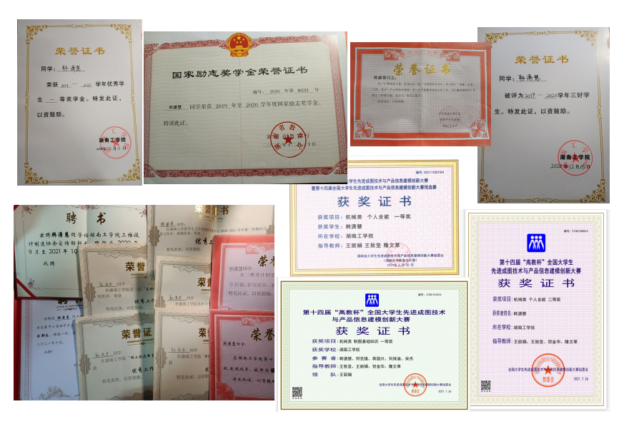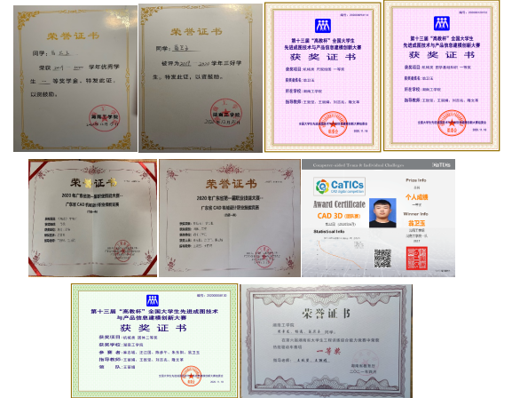 在校期间获得国家奖学金一次、校级一等奖学金两次、三好学生一次、校级二等奖学金一次,在“李冰”校友奖学金中获科技实践奖。在CaTICs竞赛中获得一等奖,在2020年广东省第一届职业技能大赛中获得个人二等奖、团队二等奖,在第十三届“高教杯”先进成图大赛获得团体全国二等奖和两项个人全国一等奖,在第六届湖南省大学生工程训练综合能力竞赛中获得热能驱动车赛项一等奖。
