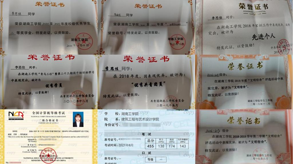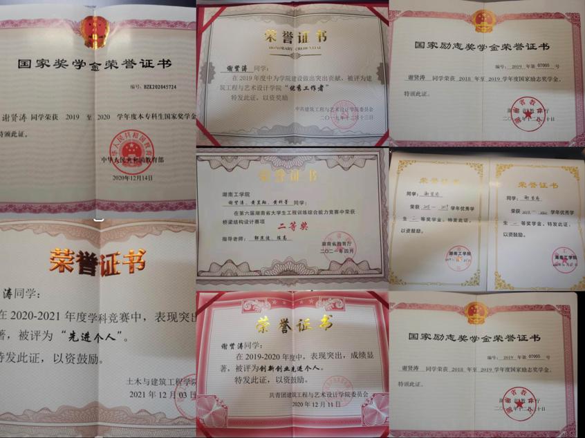 在校期间学习成绩与综合测评成绩连续三年保持专业前列,荣获国家奖学金,国家励志奖学金,校级奖学金,校级优秀学生干部,校级优秀工作者等各类荣誉20余项;获英国上市公司官网365结构设计大赛三等奖;2022届鲁班BIM毕设大赛二等奖;积极参与校内外志愿者活动,被评为“衡阳市优秀青年志愿者”。
