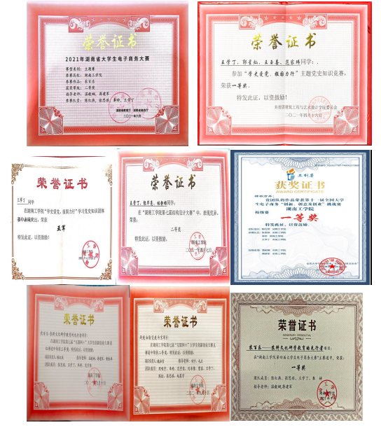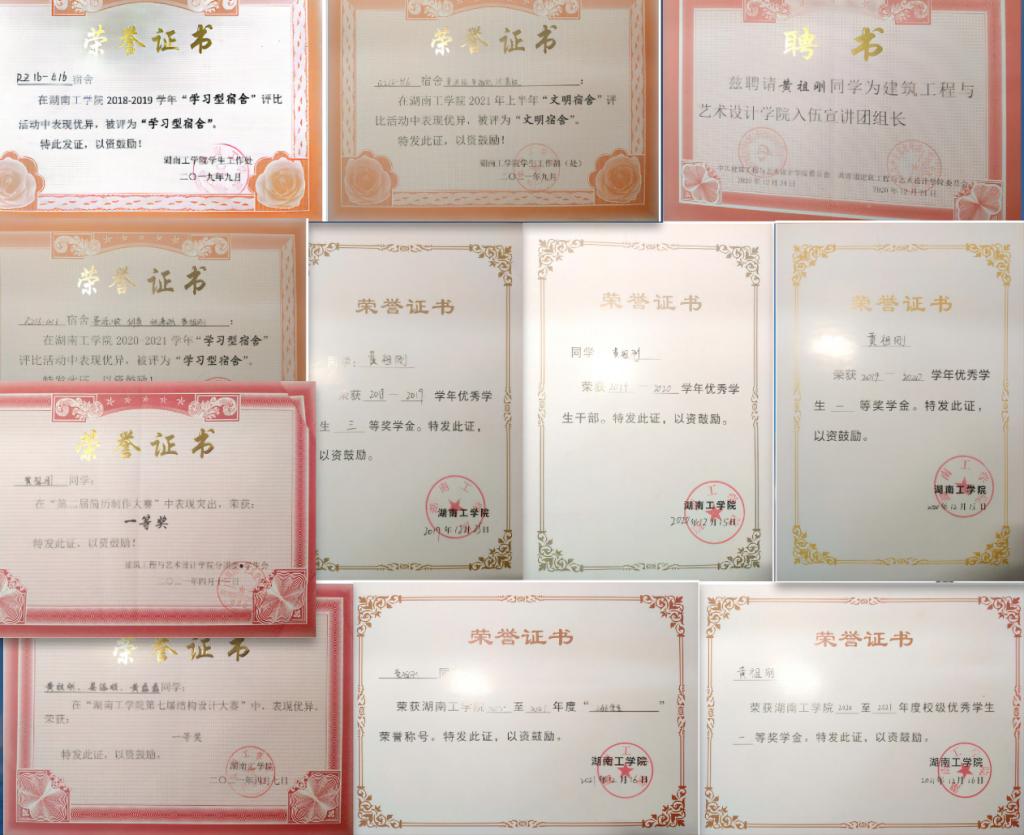 在校期间获得校级一等奖学金2次、校三好学生1次、校优秀学生干部1次、校优秀共青团员1次、校结构设计大赛一等奖、院级简历设计一等奖、学习型宿舍、文明寝室、互联网+优秀奖等荣誉。