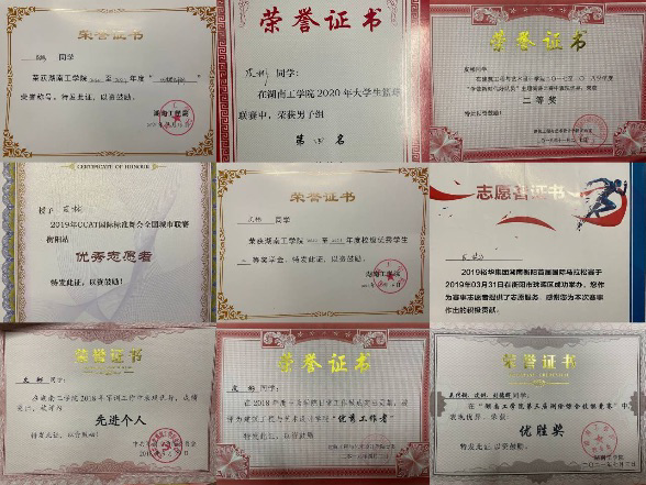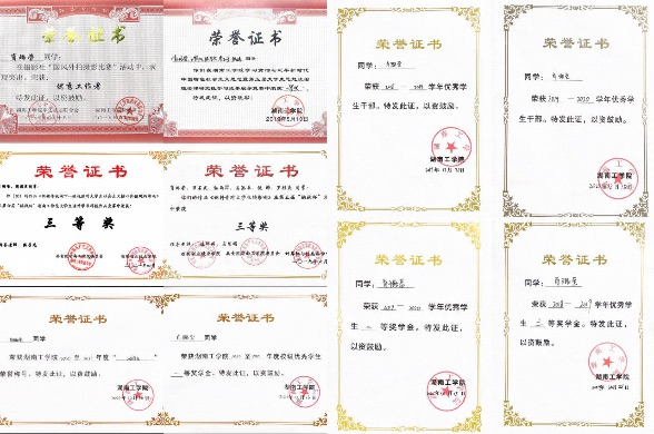 在校期间荣获国家励志奖学金3次,校级奖学金3次,三好学生1次;获优秀社团干部,优秀学生会干部和衡阳市优秀志愿者等称号;顺利通过了英语、计算机等级考试以及教资考试;在学习之余,积极参加社会实践和志愿活动。