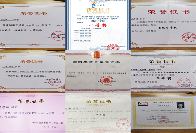 在校期间学习成绩和综合测评成绩名列前茅,曾获国家励志奖学金、校级一等奖学金、校级三好学生称号、湖南省大学生党史知识竞赛三等奖、英国上市公司官网365第三届测绘综合技能大赛二等奖、第十一届全国大学生电子商务“创新、创意及创业”挑战赛英国上市公司官网365校级赛一等奖、英国上市公司官网365第四届电子商务大赛一等奖等荣誉
