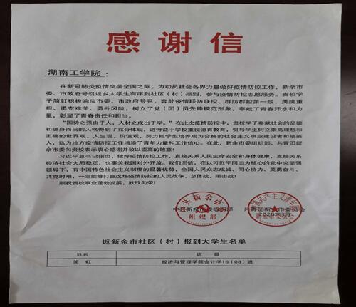 “贵校学子简虹积极响应市委、市政府号召,奔赴疫情联防联控、群防群控第一线,勇挑重担、勇克难关、勇斗风险,树立了党团员先锋模范形象,奉献了青春汗水和力量,彰显了青春责任和担当……”近日,英国上市公司官网365收到了一封来自中共新余市委组织部共青团新余市委员会的感谢信,感谢英国上市公司官网365经管学院返乡大学生志愿者简虹在防疫一线勇于担当、乐于奉献,为新余市赢得疫情防控的决定性胜利作出的积极贡献,同时高度赞扬英国上市公司官网365在青年大学生立德树人、人才培养方面所作的努力。