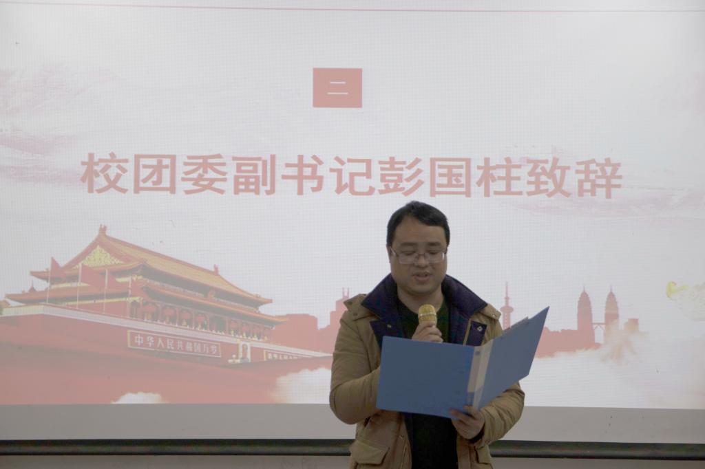 主题团日活动在大学生艺术团舞蹈队曼妙的舞姿中拉开了序幕。彭国柱在致辞中表示,党的十九届五中全会在我国正处于“两个一百年”奋斗目标历史交汇点上召开的一次重要的会议,开启了建设社会主义现代化强国的新征程,而当代青年既是追梦者,也是圆梦人,学习贯彻十九届五中全会精神更是显得尤为重要。他希望全校团学干部在追寻梦想的途中,做到坚定理想信念、发奋成长成才、勇于开拓创新、锤炼高尚品德,培养积极乐观的人生态度,塑造苦干实干的务实作风,创造属于自己的人生精彩。