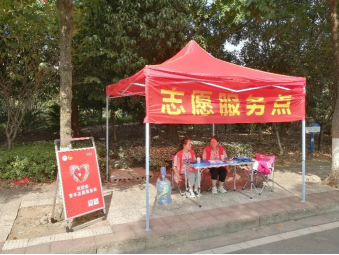 图为摆设在东门篮球场旁的志愿服务点
