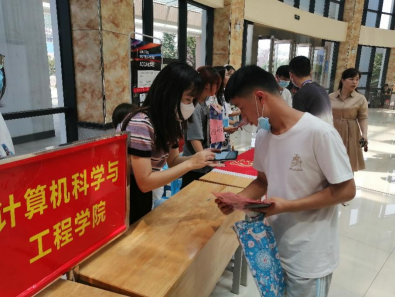 图为志愿者们在阳光服务大厅接待新生及家长