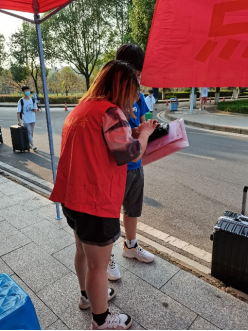 9月13日上午,校团委老师贺令亚、毛娜走访了各志愿服务点,问候志愿者并询问其服务开展情况。贺令亚勉励同学们在做好志愿服务的同时要及时思考总结,做到学思悟行。根据工作实际,团委还及时调整了润泽公寓志愿服务点位置,并联系安排了校园摆渡车为新生们搬运行李。