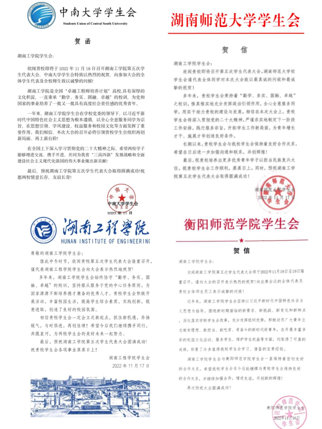 各校学生会通过贺信贺函的形式共叙发展,共收到中南大学、湖南大学、湖南师范大学、长沙理工大学、湘潭大学、南华大学、湖南理工学院、衡阳师范学院等21所兄弟院校发来的贺信。