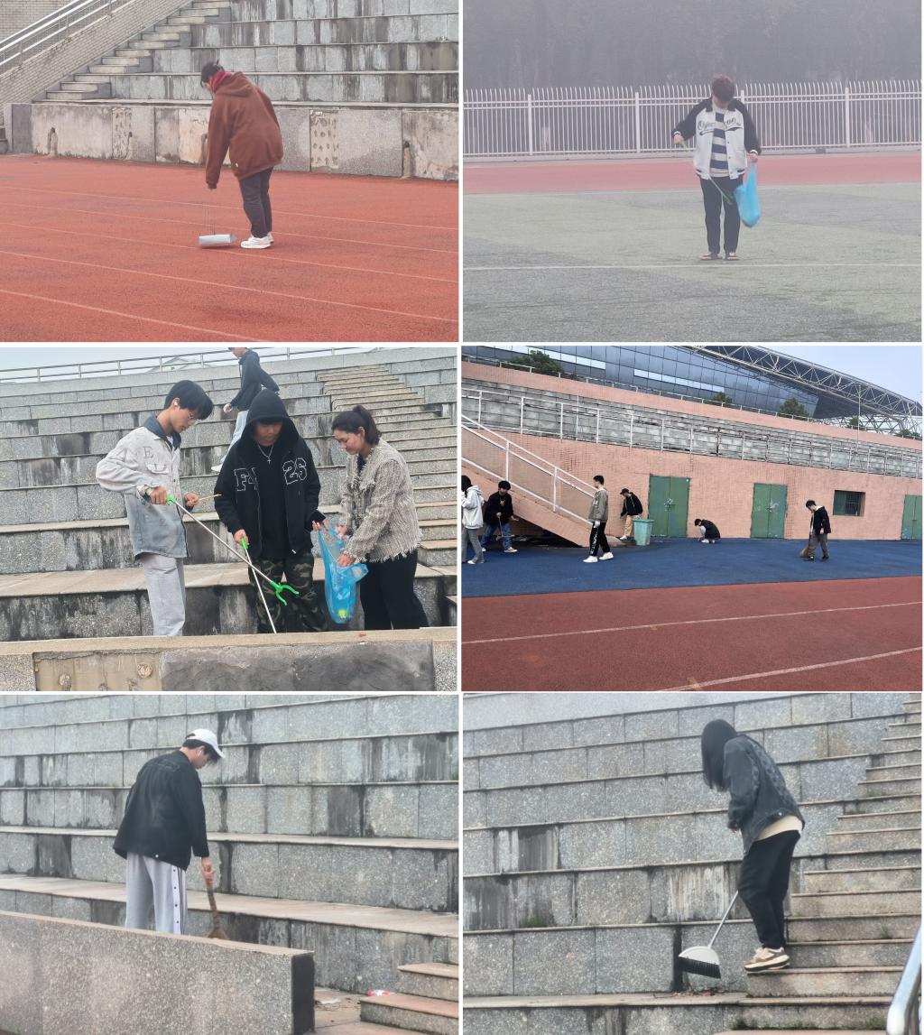 本次活动主要组织志愿者对南北操橡胶跑道、绿茵草地以及各个卫生死角进行彻底清理。在活动过程中,志愿者们个个积极主动,干劲十足,他们或是在清扫塑胶跑道和看台上的垃圾,或是在清理排水沟的杂物,或是在弯腰捡拾地上的垃圾,……这来回走动的“忙碌身影”宛然成了校园里一道靓丽的风景。