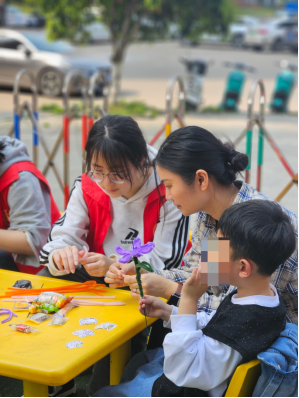 活动中,志愿者和孩子们开始了游戏和交流,进行了喊麦、母鸡下蛋、猫捉老鼠、制作手工花等活动,丰富了孩子们的课余生活。