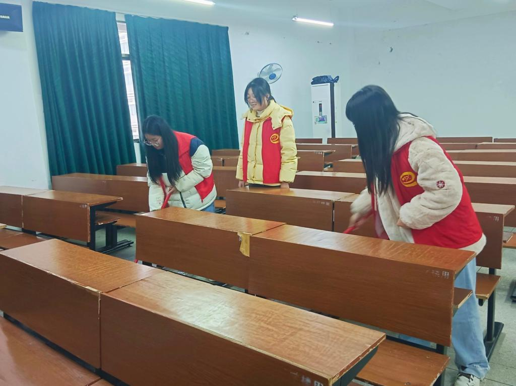 活动伊始,志愿者们统一身着红马甲,手着扫把,笤帚等清扫工具,分工合作对信息楼进行打扫。大家或整理书柜,或清理垃圾,或扫地拖地,又或擦拭窗户和书桌,相互配合着,从走廊到大厅,志愿者们认真打扫,力争做到环境卫生不留死角,充分发扬不怕脏、不怕累的精神。在志愿者们的共同努力下,让信息楼的办公、教学区域都得到了全面的清扫,干净整洁的环境让人眼前一亮。