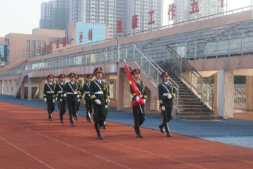 在清晨的微光中,军容严整的国旗护卫队踏着铿锵有力的步伐,伴随着国歌护卫国旗健步入场。鲜艳的五星红旗冉冉升起。全体师生肃立,面向国旗行注目礼。