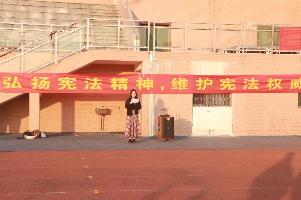 日语2401班董倩同学作为学生代表发言。她倡议全体学生要认真学习宪法,培养法治观念,增强社会责任感和公民意识,自觉遵守和维护宪法,以实际行动践行宪法精神。